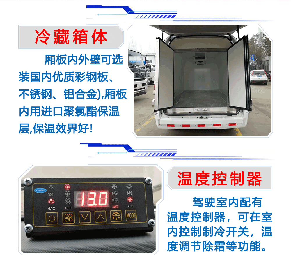 上裝配置:箱體采用內(nèi)外玻璃鋼,中間8cm厚高密度保溫板,不銹鋼鎖件、門框、鉸鏈,鋁合金型材包邊、包角、陰角條,隔溫條,鋁花紋底板。